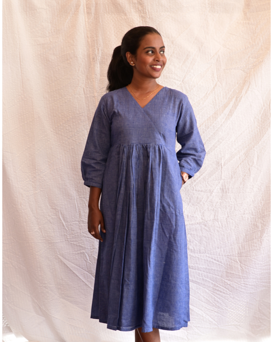 BENGAL HANDLOOM COTTON BLUE CHECK GATHERED DRESS