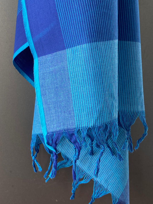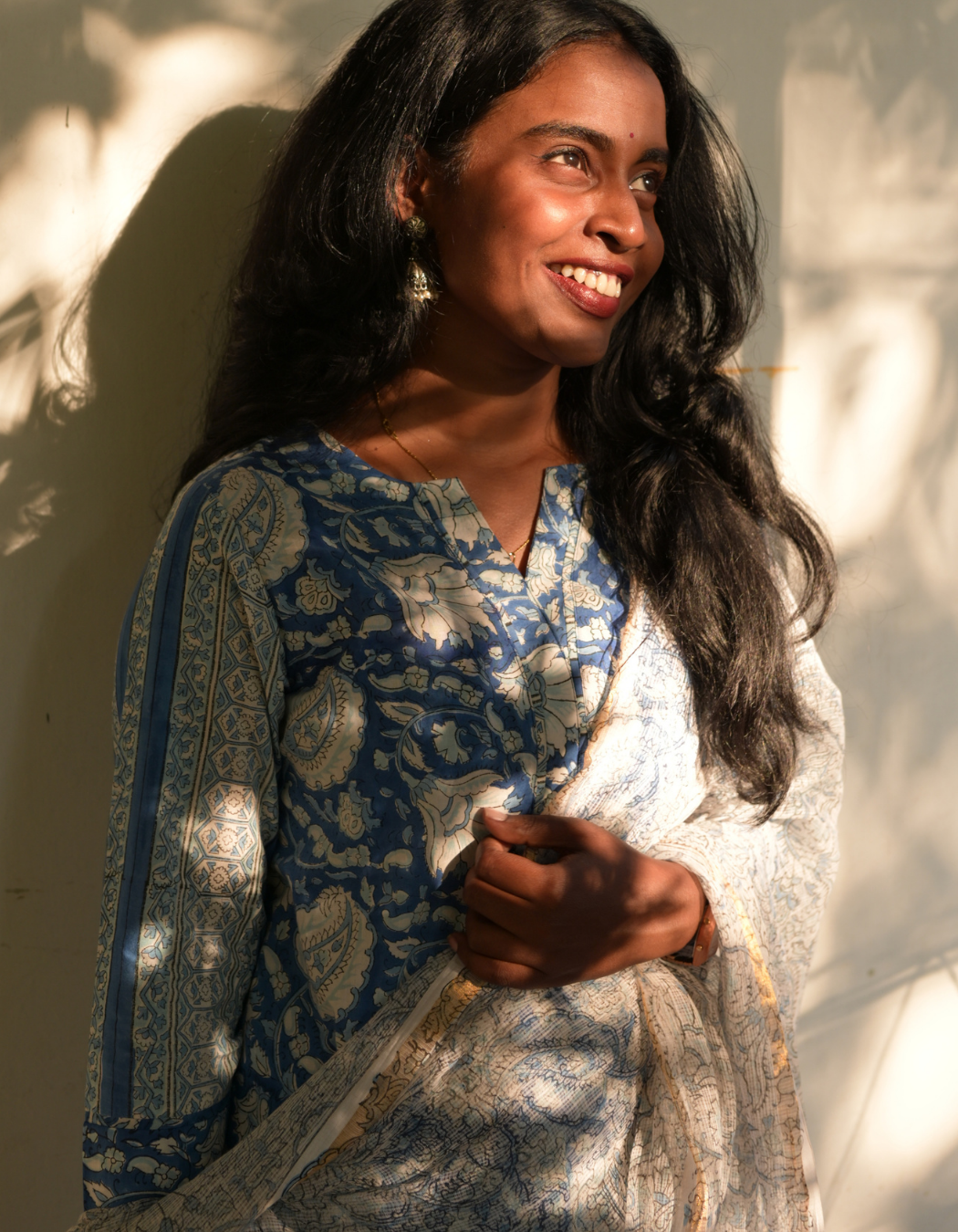 "NIRAM" Teal Blue Sanganeri Hand block printed cotton kurti set with Kota Doriya dupatta.