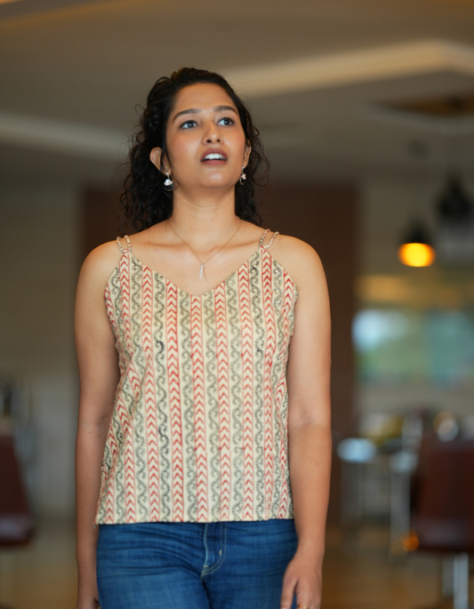 " SPAGHETTI CROP TOP "Beige Block printed.