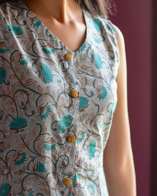 "A LINE DRESS" GREY FLORAL HANDBLOCK PRINTED