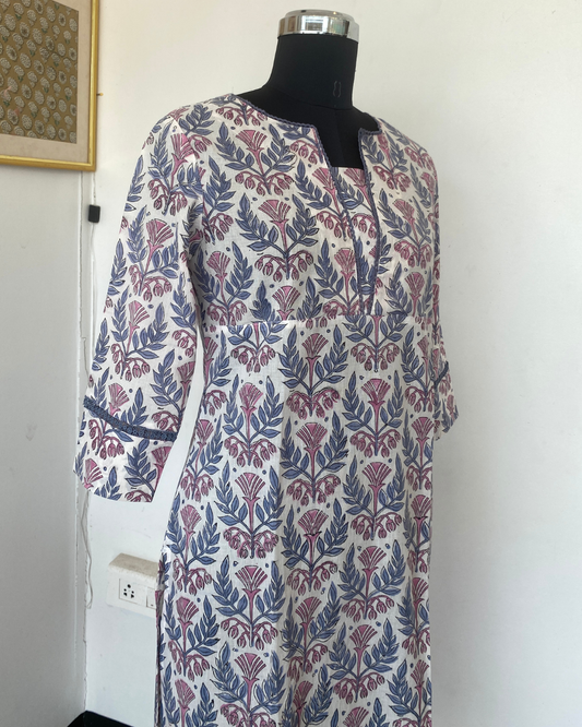 "CHAMPA" white and blue Floral Hand Block Printed Lace Kurti