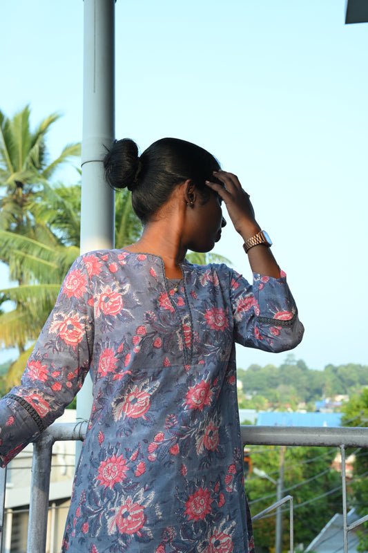"CHAMPA" Cool Grey Floral Hand Block Printed Lace Kurti