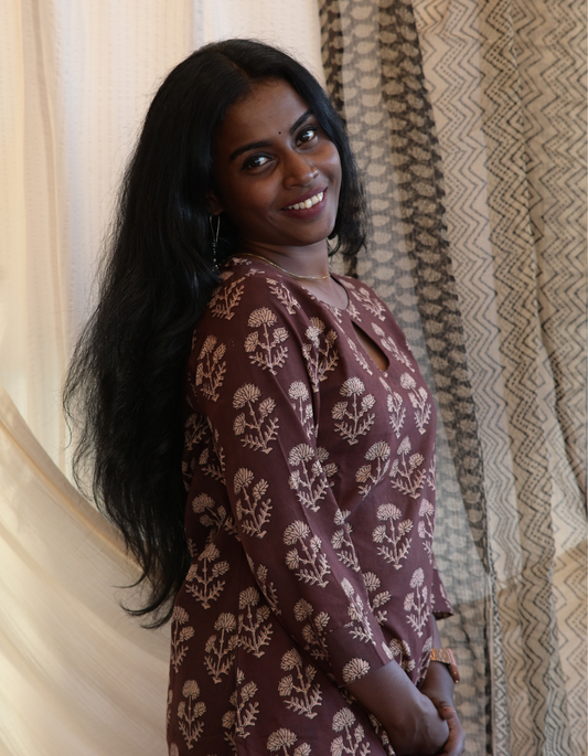 "HAWA" BROWN BUTTA HANDBLOCK PRINTED KEY HOLE KURTI