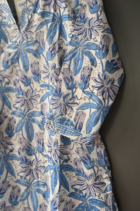 Blue and White Hand Block Printed With Kantha Work V neck Kurti