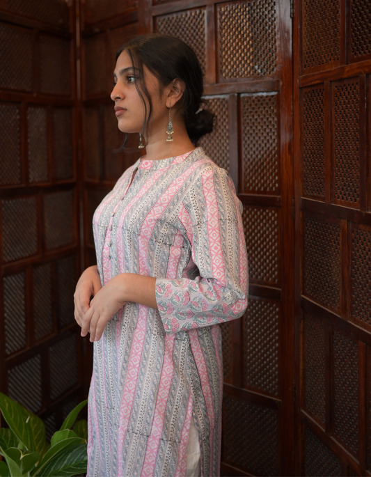 Pink and Grey Hand Block Printed Cotton Collar Neck Kurti