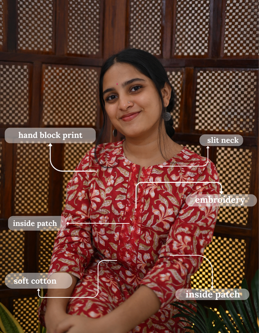 "INAYA" Red Floral Embroidered Hand Block Printed Kurti