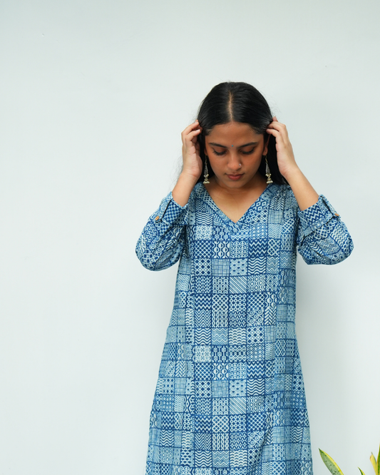 "SAANJH" Indigo Printed Princess cut Cross V Neck Kurti