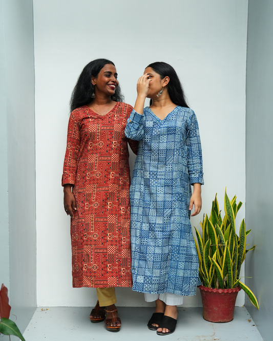 "SAANJH" Red Ajrakh Printed Princess cut Cross V Neck Kurti