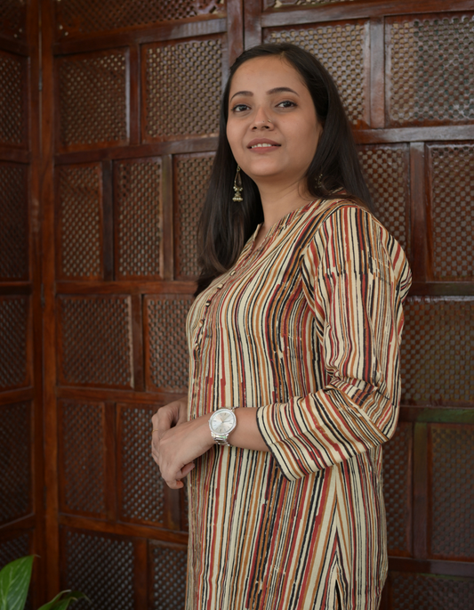 Brown Striped Bagru Hand Block Printed Cotton Collar Neck with botton Kurti