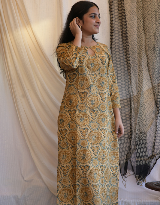 "HAWA" MUSTARD YELLOW HANDBLOCK PRINTED BUTTA KEY HOLE KURTI