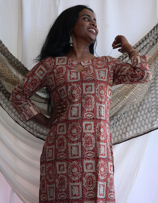 "HAWA" RED HANDBLOCK PRINTED BUTTA KEY HOLE KURTI