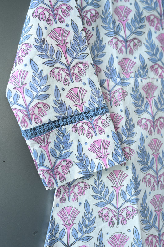 "CHAMPA" White with Grey Floral Hand Block Printed Cotton Lace Kurti