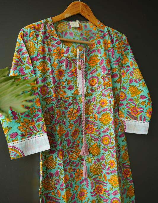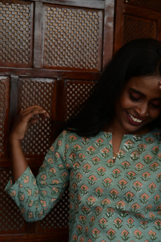 Pastel Green Floral Hand Block Printed Kurti