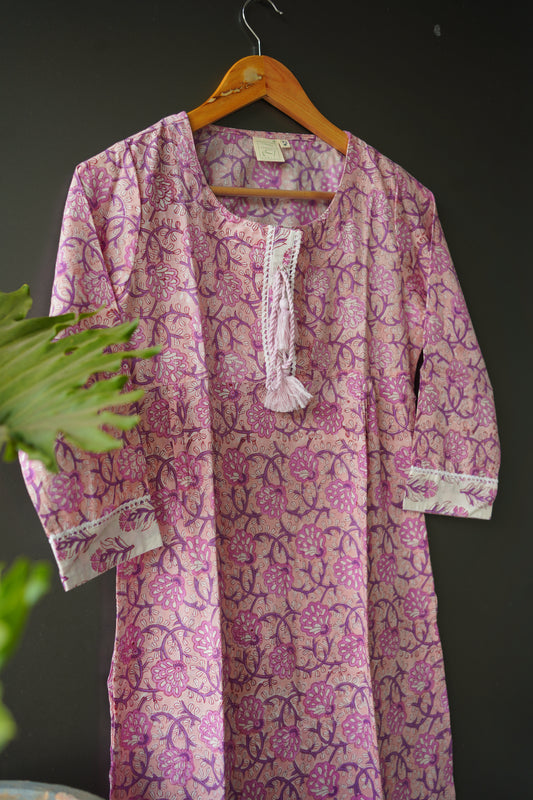 Lace Purple Floral Hand Block Printed Kurti