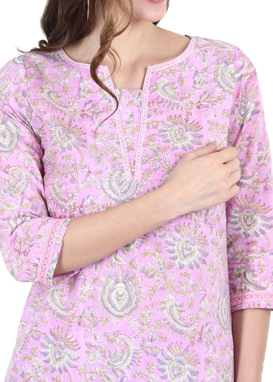 Pink Lace Floral Hand Block Printed Kurti