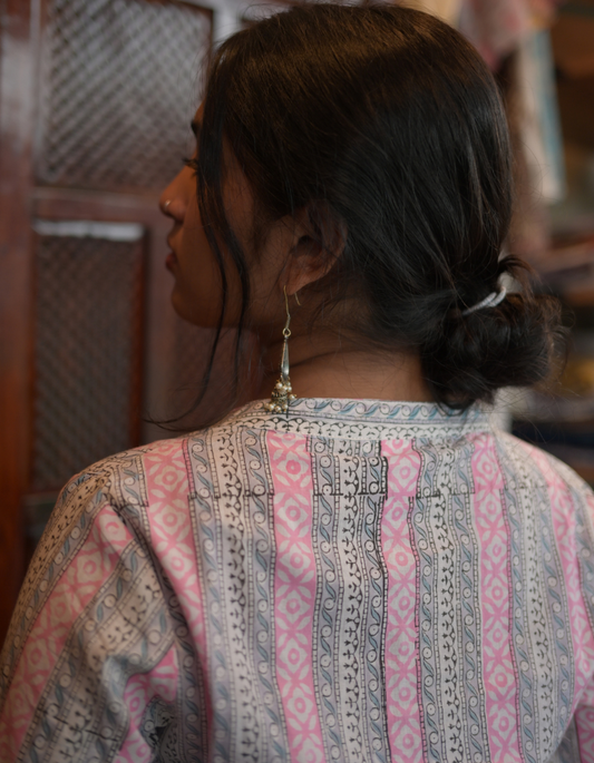 Pink and Grey Hand Block Printed Cotton Collar Neck Kurti and pant set