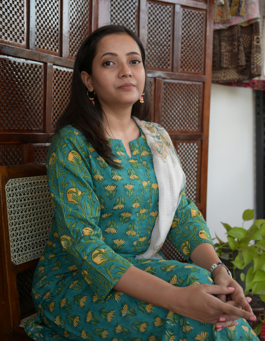 "NIRAM"TEAL GREEN SANGANERI FLORAL PRINTED KURTI SET WITH DUPATTA