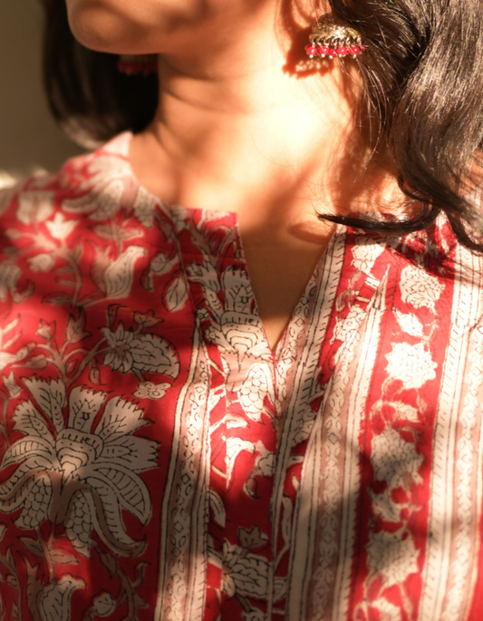 "NIRAM" Red Sanganeri Hand block printed cotton kurti set with Kota Doriya dupatta
