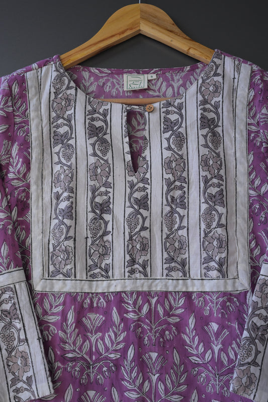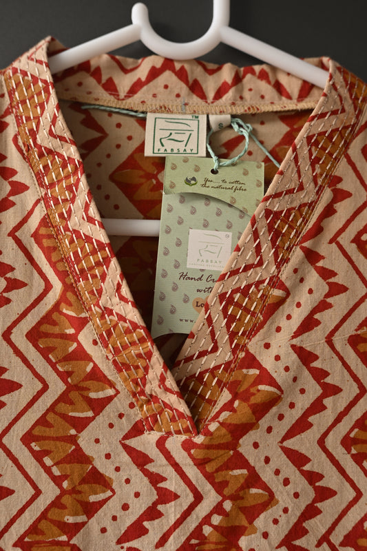 Bagru Hand Block Print With Kantha Embroidery V Neck Kurti