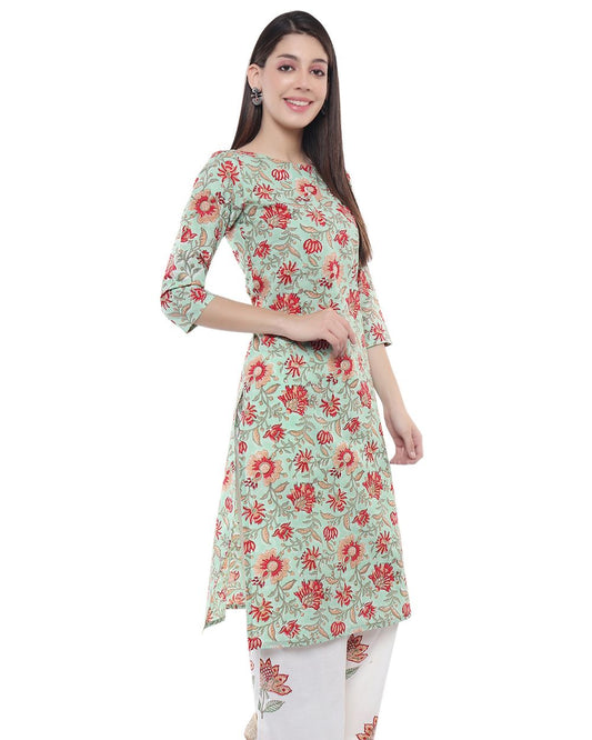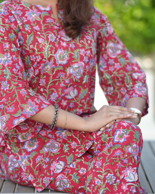 CO-OD SETS RED FLORAL HAND BLOCK PRINTED STARIGHT PANTS