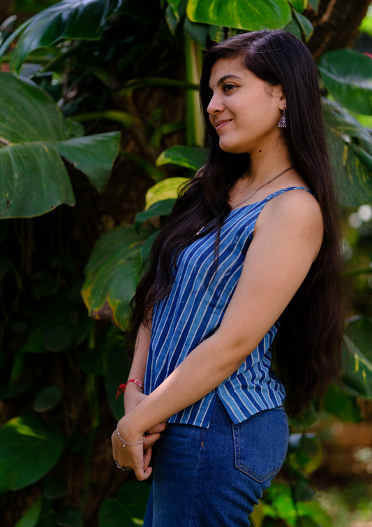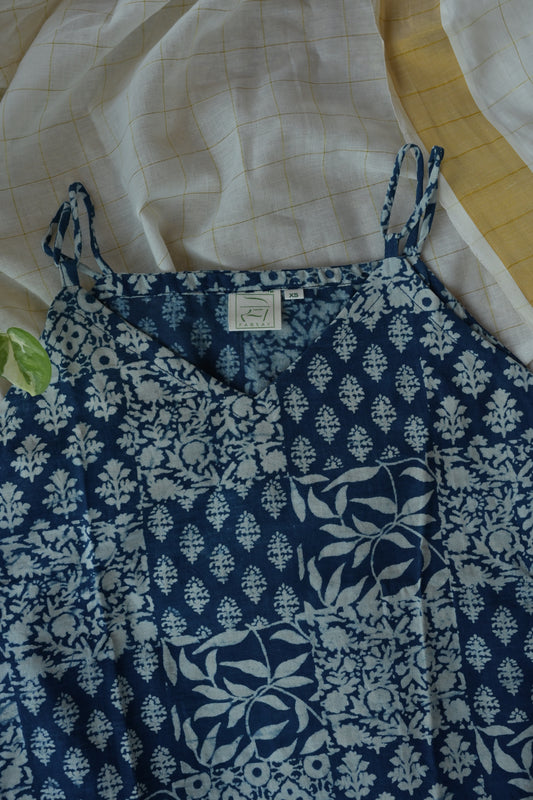"SPAGHETTI CROP TOP" Indigo Floral Printed