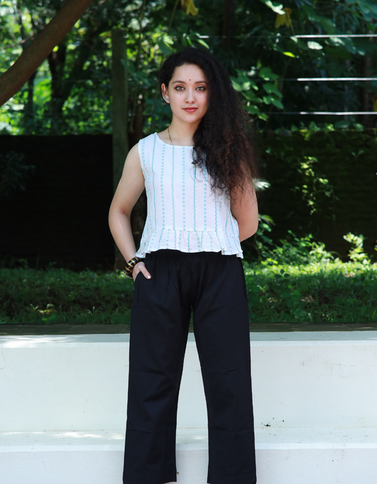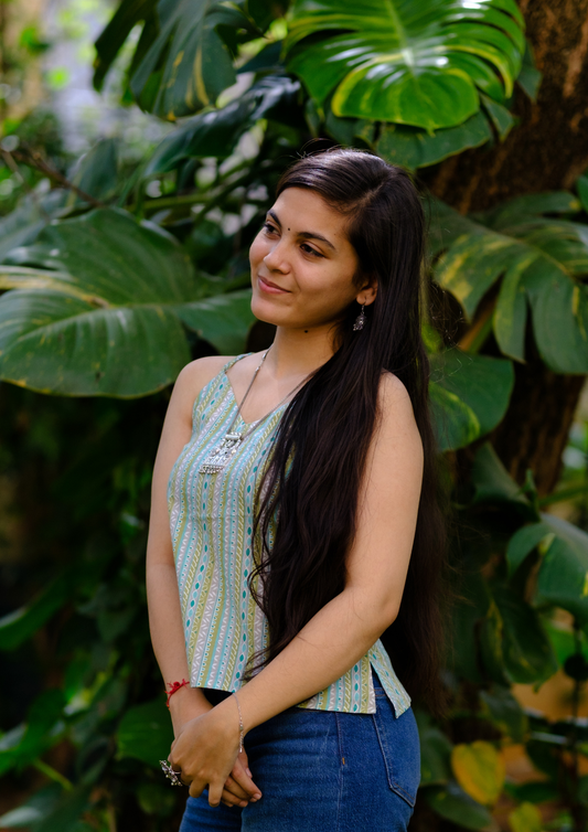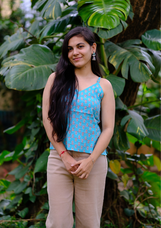 "SPAGHETTI CROP TOP"Blue kantha work printed