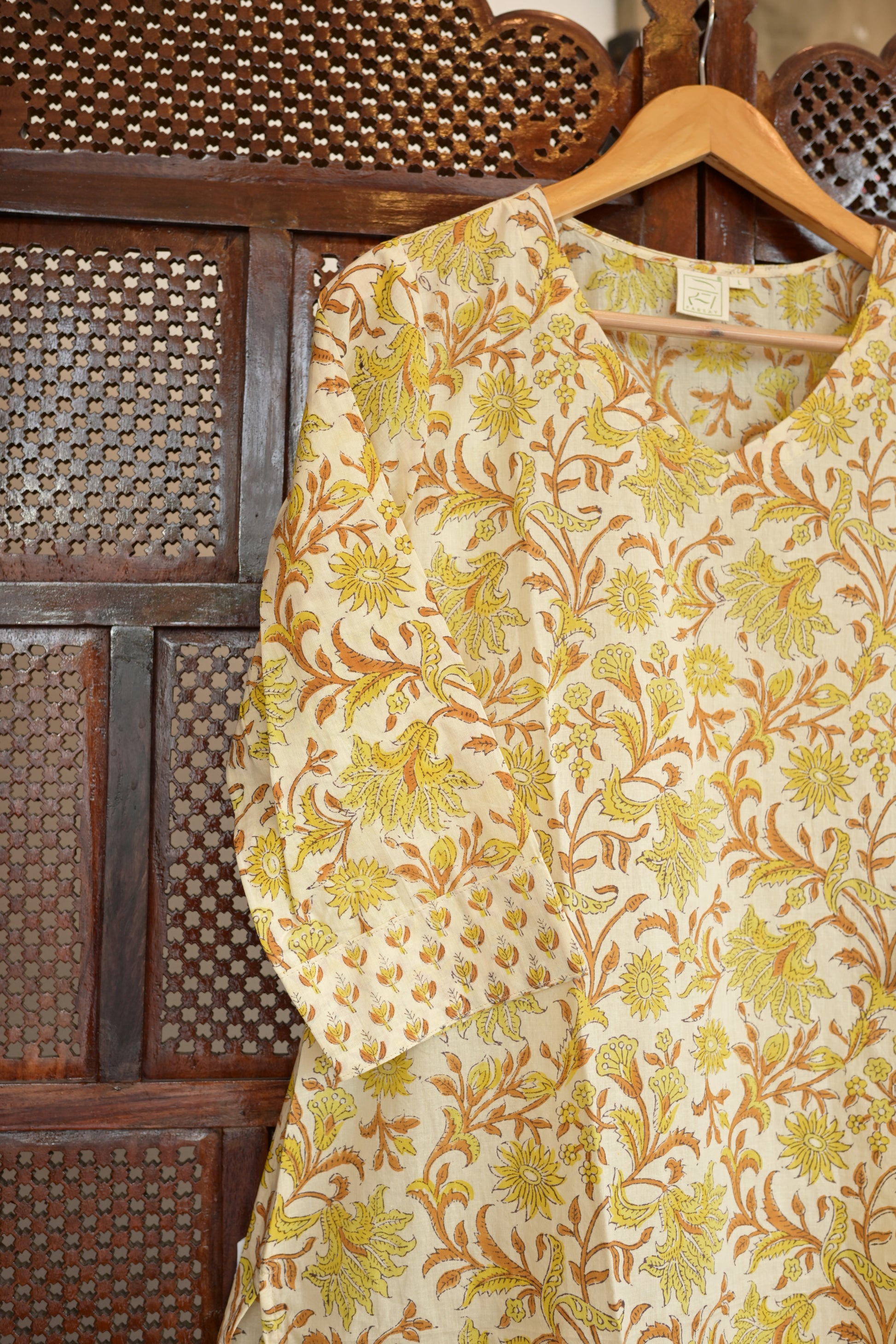 ROOH - CREAM AND LIGHT YELLOW FLORAL SANGANERI PRINTED COTTON CURVD - V NECK KURTI