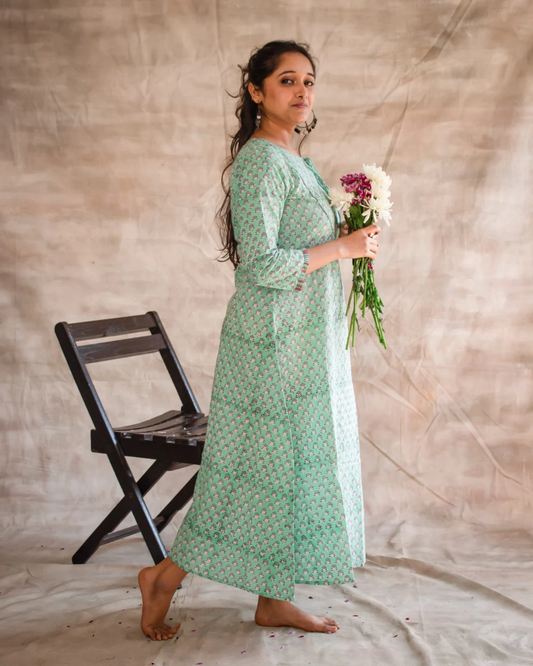"A- LINE DRESS" Mint Green Floral Hand Block Printed