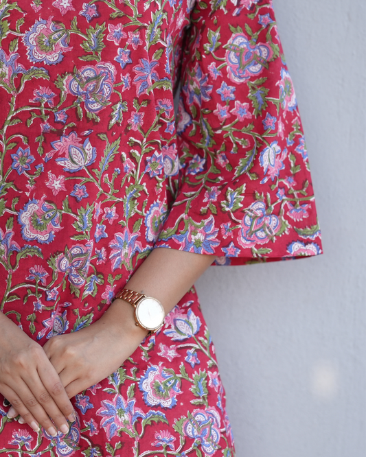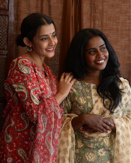 "NIRAM" Red Sanganeri Hand block printed cotton kurti set with Kota Doriya dupatta