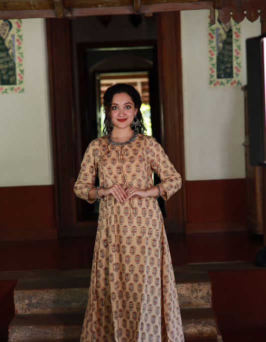 Beige Floral Hand Block Printed "A LINE DRESS"