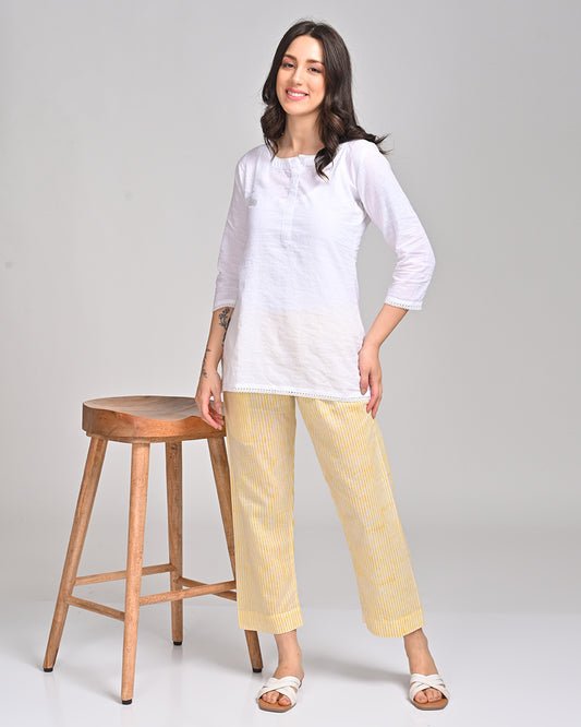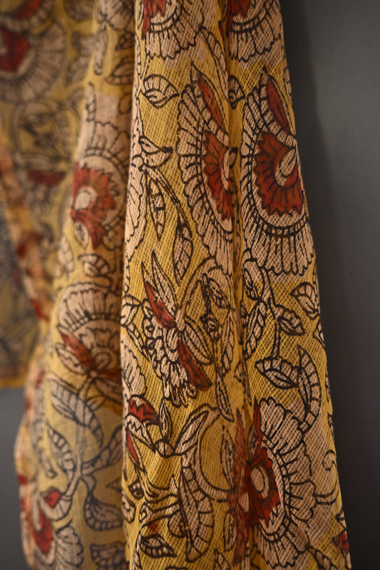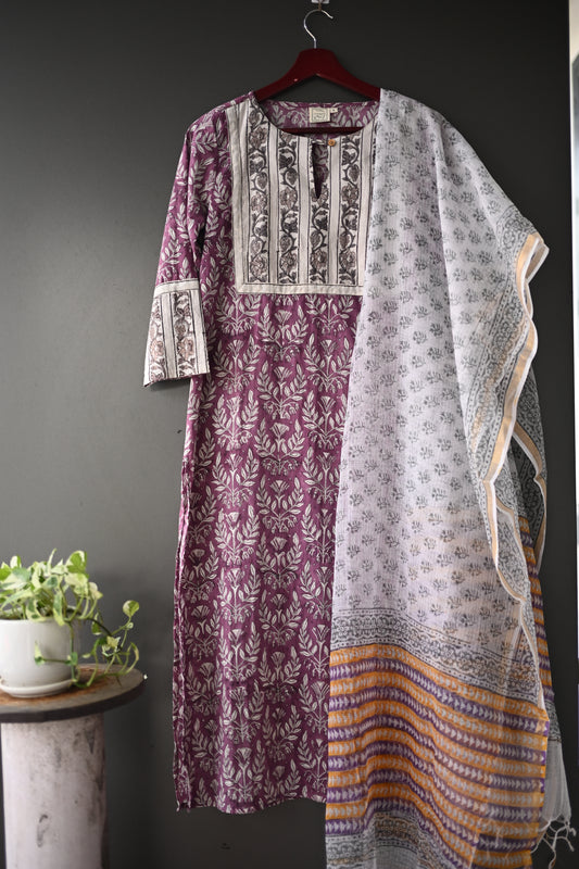 "NIRAM" Yellow Sanganeri Hand block printed cotton kurti set with Kota Doriya dupatta.